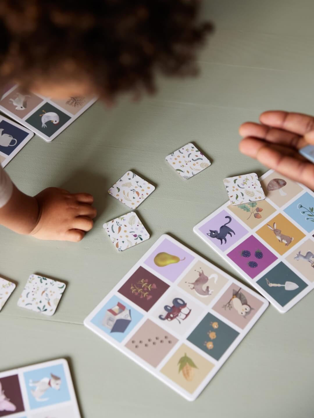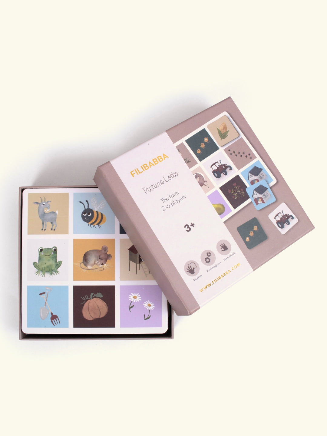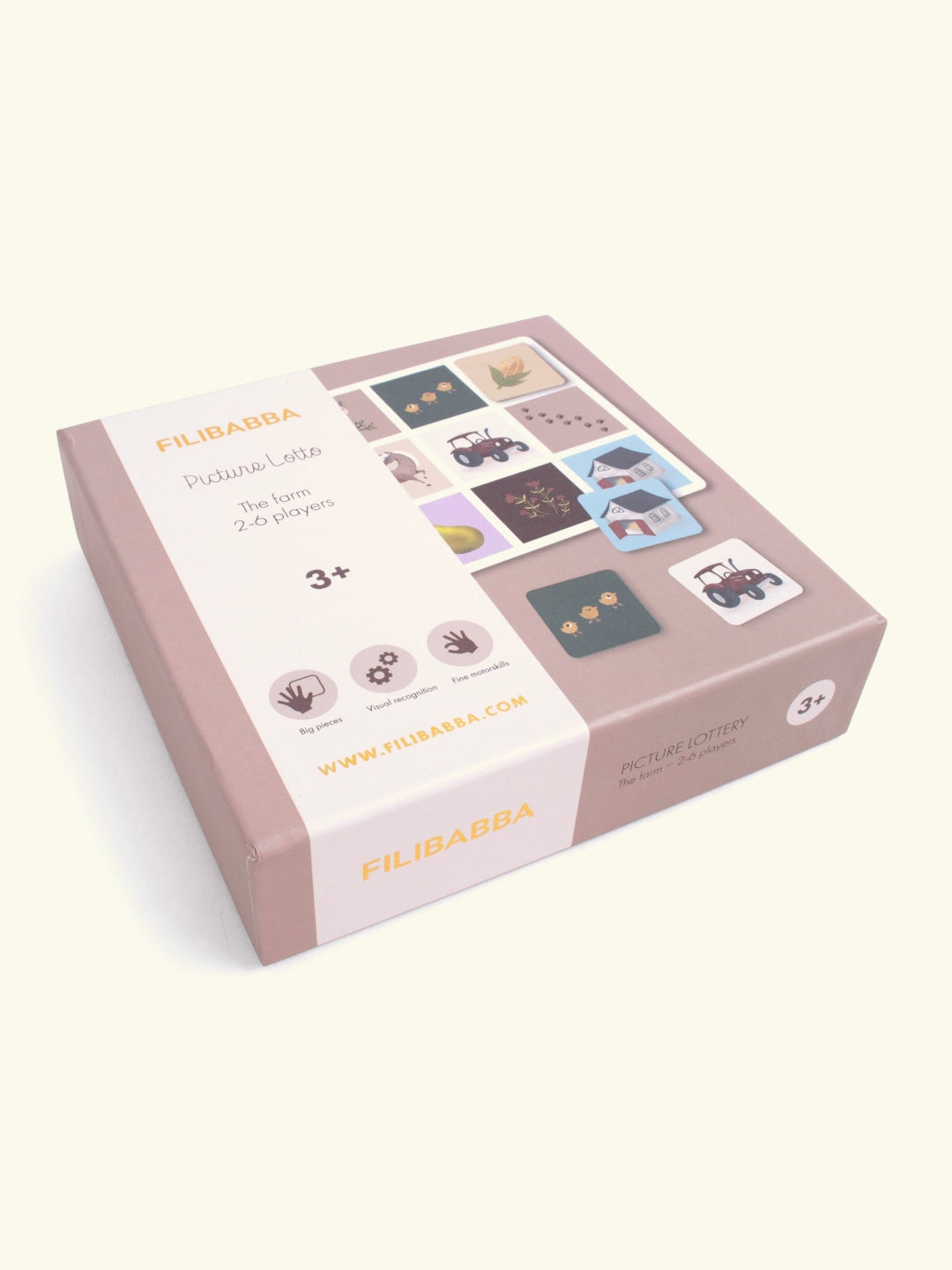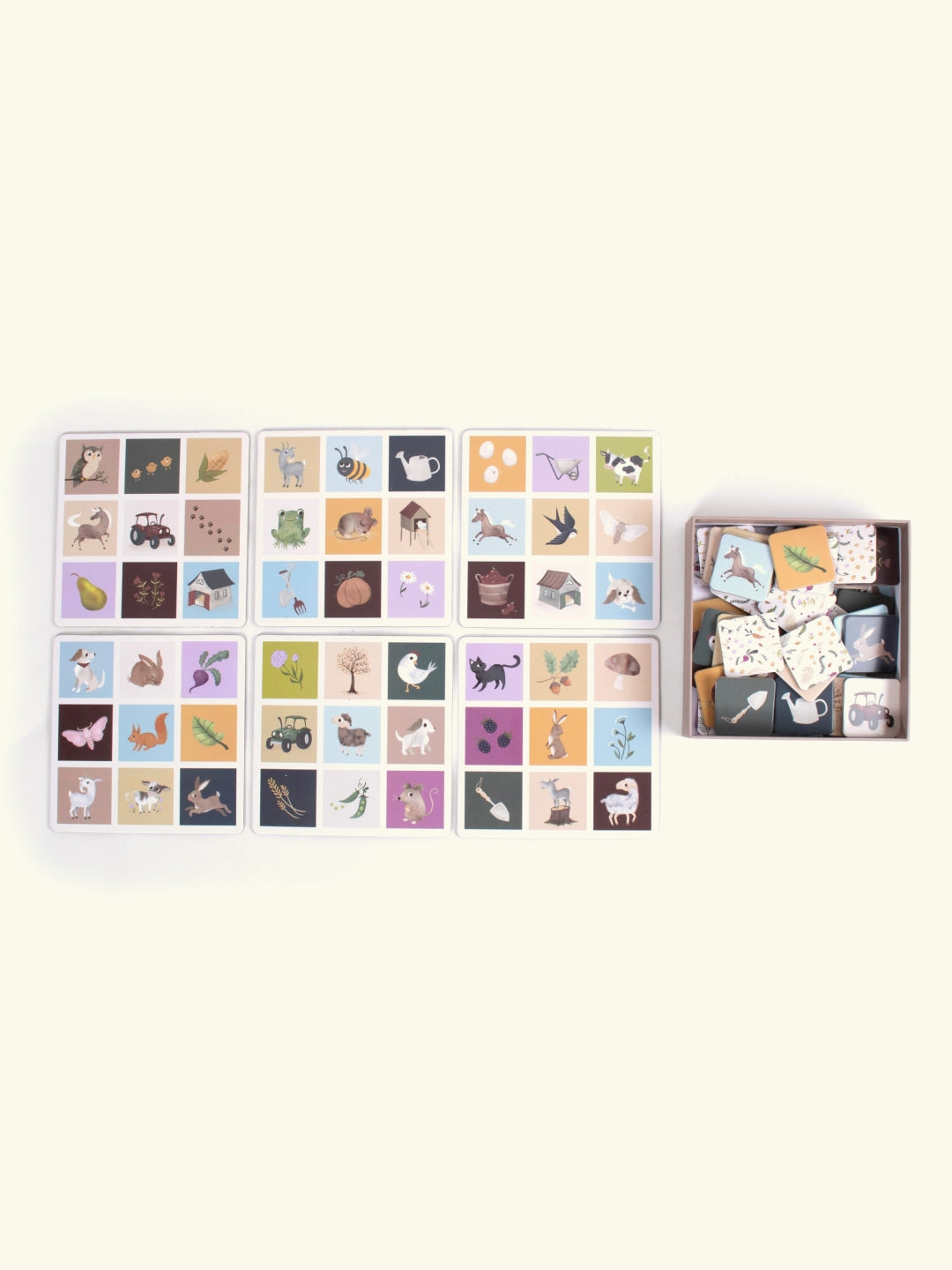 The picture lottery game contains 6 boards and 54 game pieces with colourful hand drawn illustrations picturing cute animals and beloved elements from farm life.