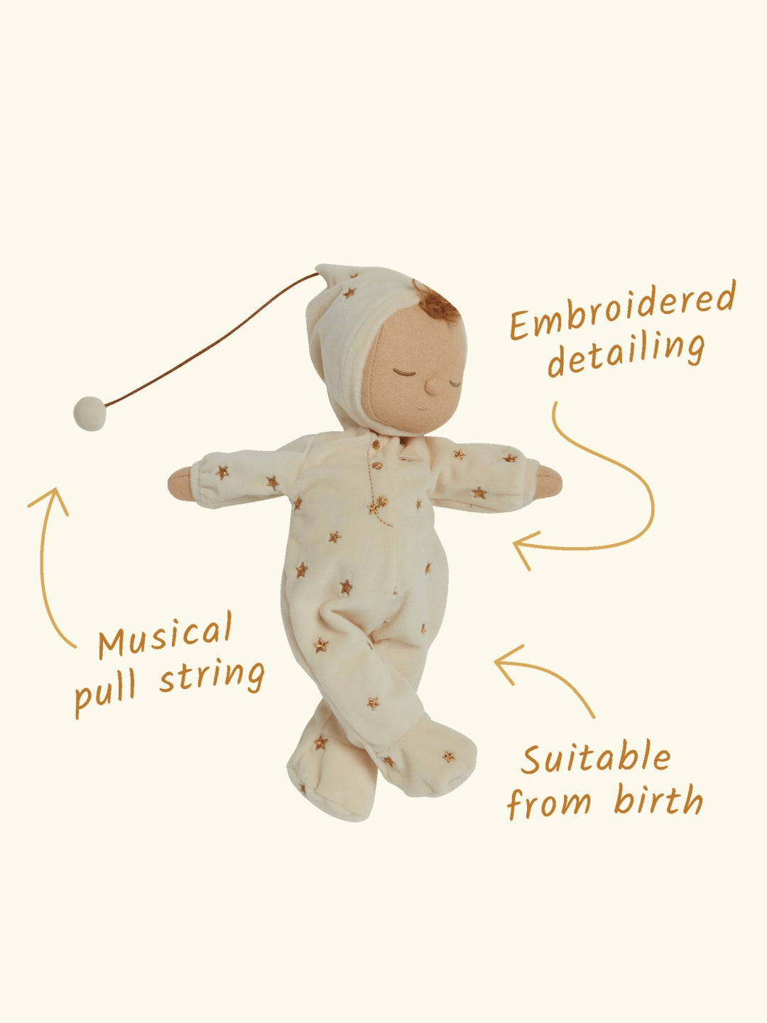 With the same huggable, soft, comforting design as the most-loved Dozy Dinkums, Lullaby Lyra comes with a little pompom on the end of their bonnet which when pulled plays a sleepy tune. Baby Lyra is a special gift to welcome a newborn baby.