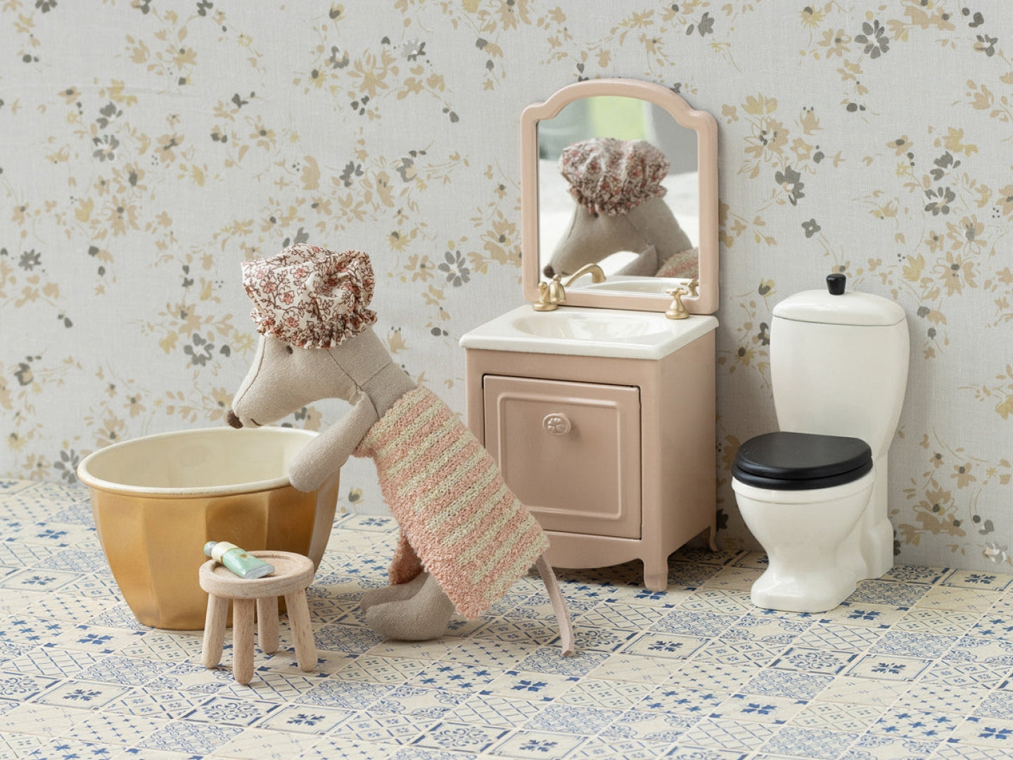 Like everyone else, this mouse loves to spend hours in the warm water in her lovely bathtub. This playset contains a golden metal bathtub, a big sister mouse, a showercap and a towel.