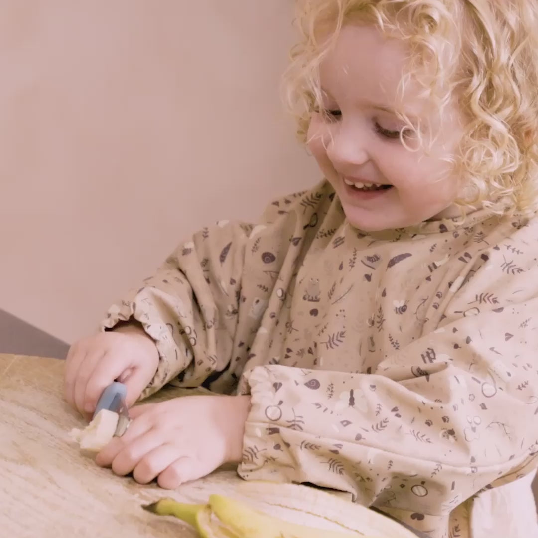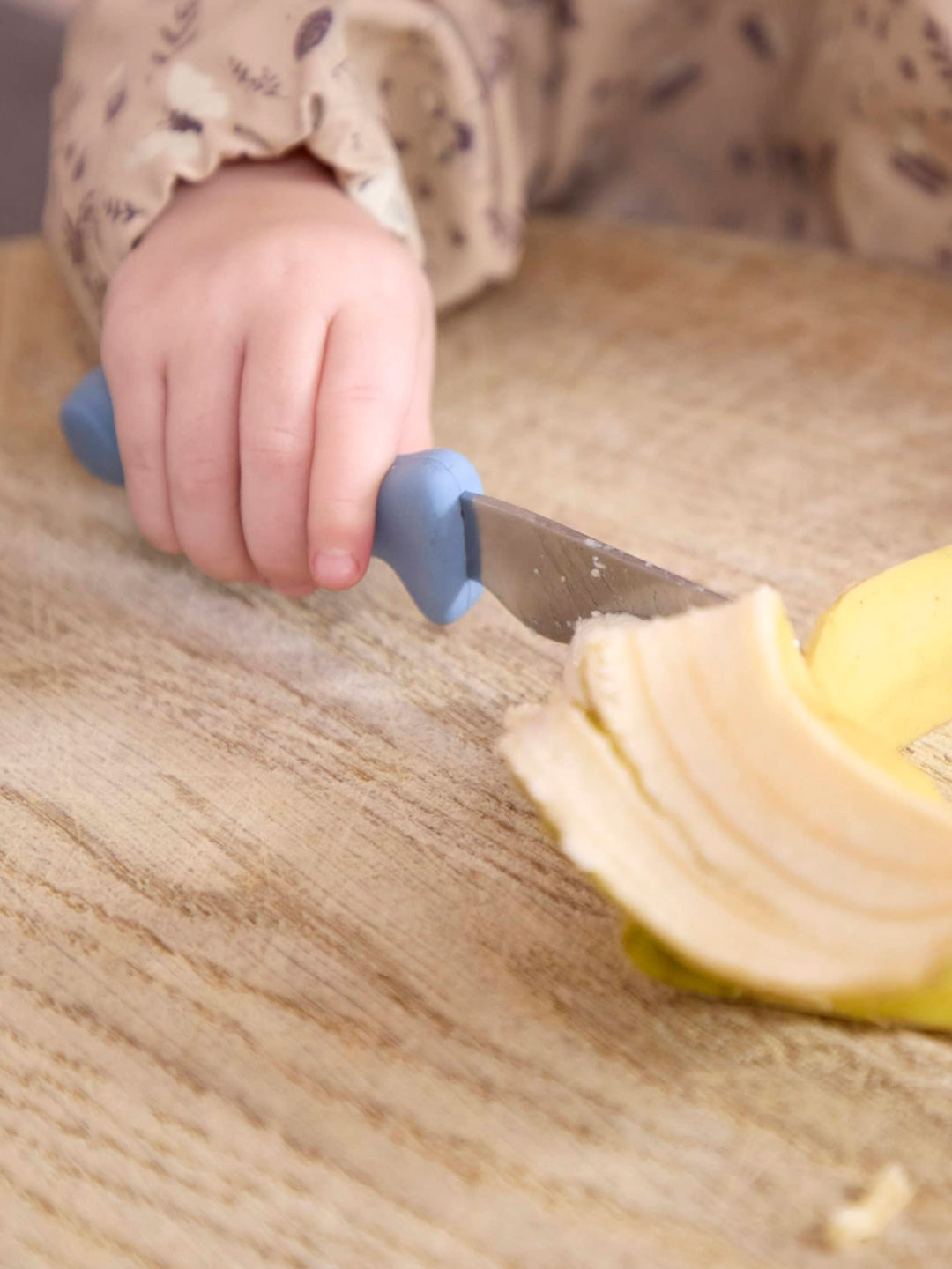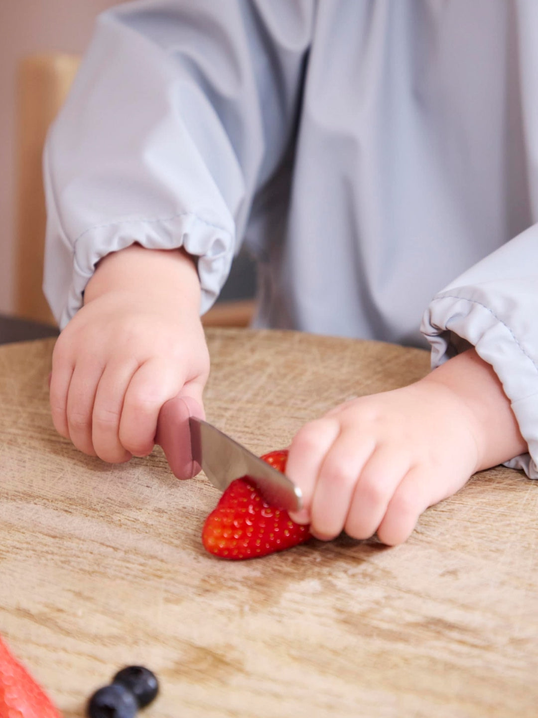 This set of beginners' knives includes a serrated knife and a knife with a regular stainless steel blade that can cut fruit and vegetables. Soft silicone handles with a safety barrier between blade and fingers are easy to hold for small hands.