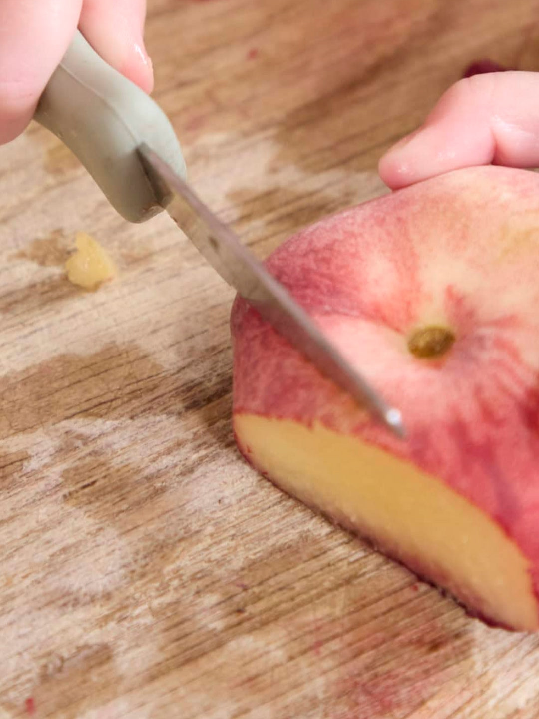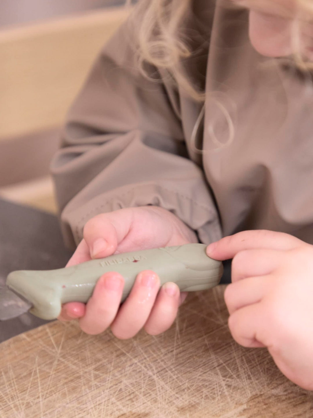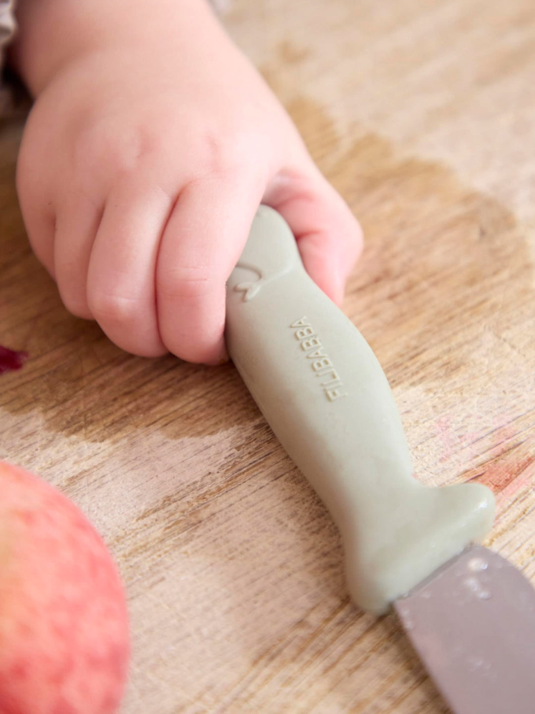 This set of beginners' knives includes a serrated knife and a knife with a regular stainless steel blade that can cut fruit and vegetables. Soft silicone handles with a safety barrier between blade and fingers are easy to hold for small hands.