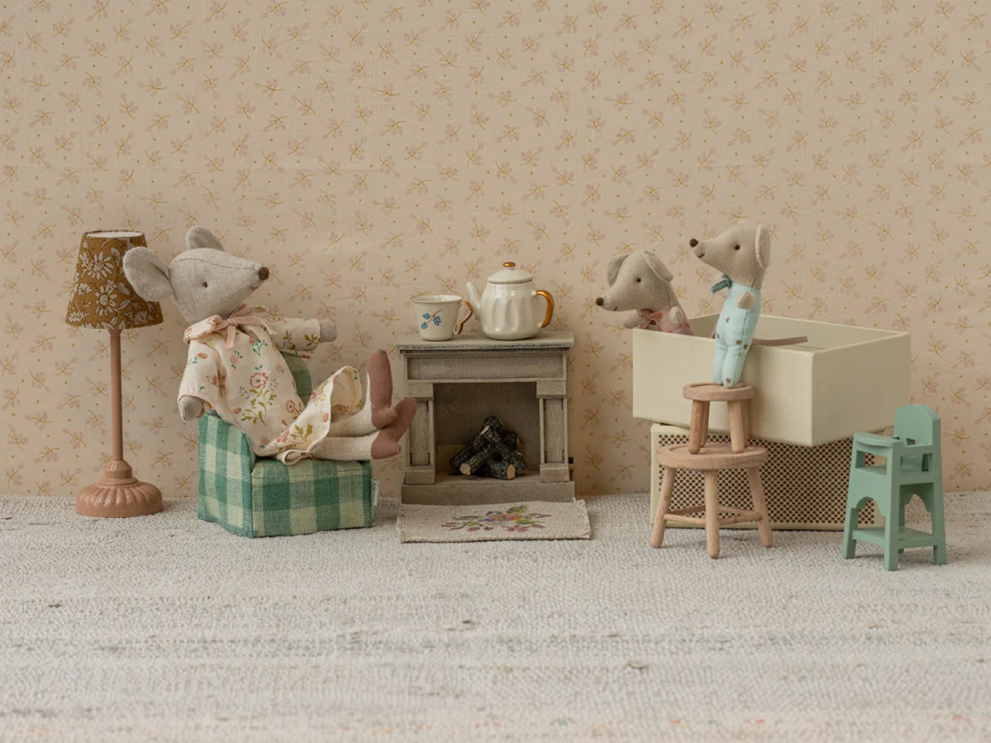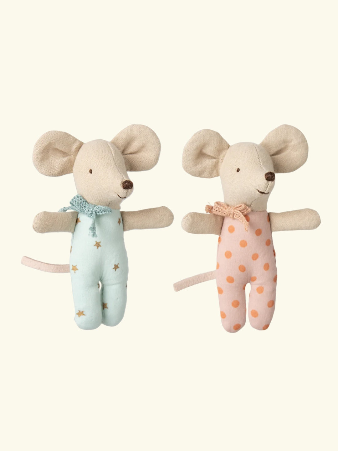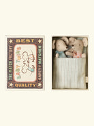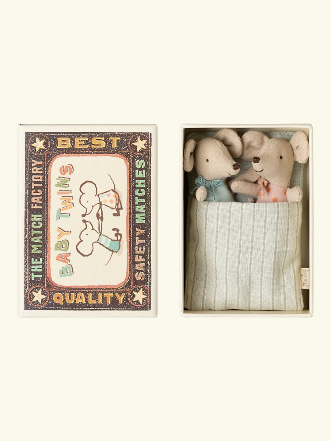 A classic Maileg item. These baby twin mice sleep safely in their sleeping bag side by side, tucked in the matchbox bed. These mice fit all accessories in size baby mouse. Fabric may vary.