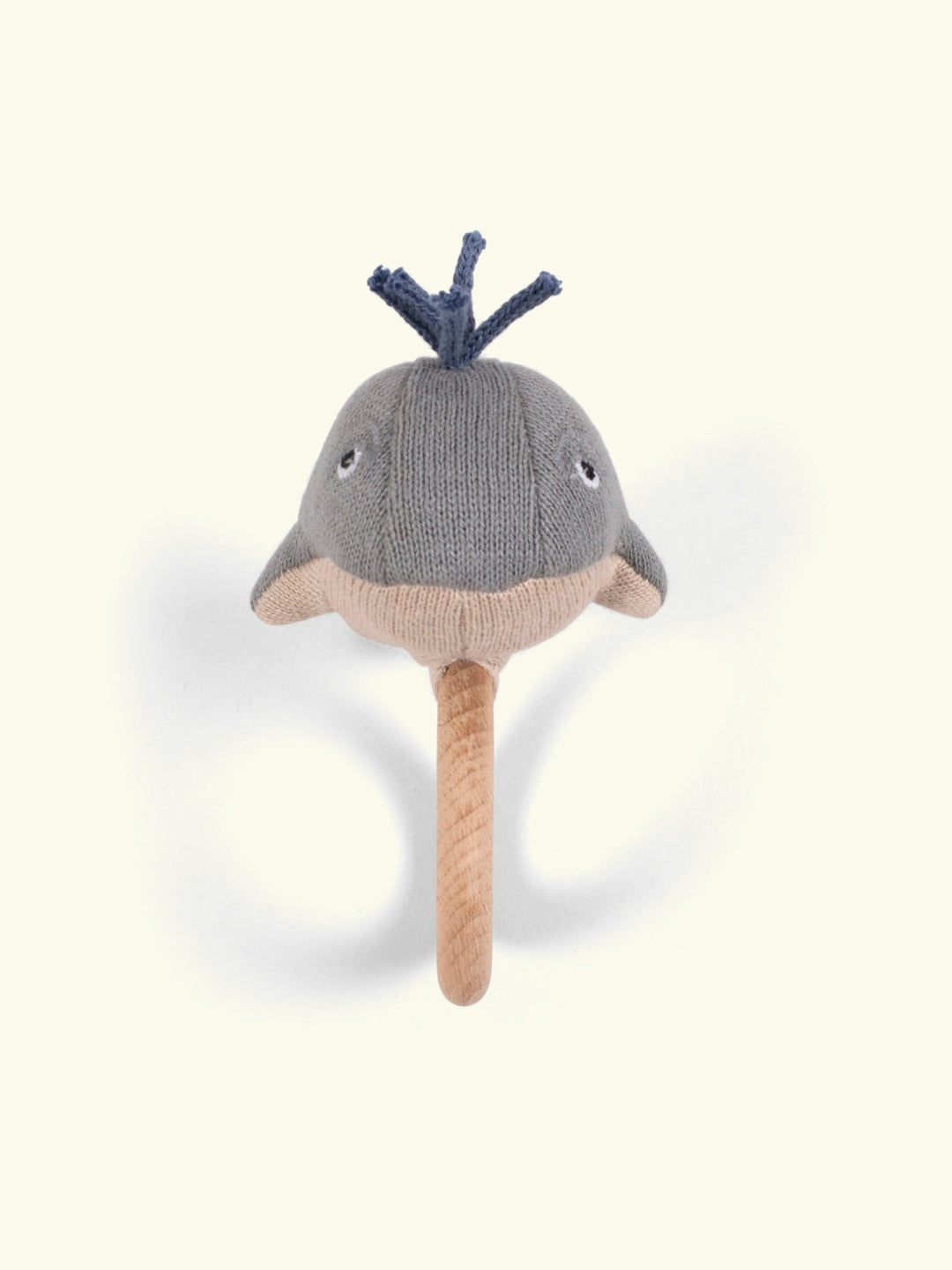 Willie the whale rattle is a cute handmade knitted whale, designed with a small bell inside which gives a nice sound when you shake it and with blue ribbons illustrating water splashes. The whale is sewn on a wooden ring and can therefore be used as a rattle. It provides a good grip for even the tiniest hands.