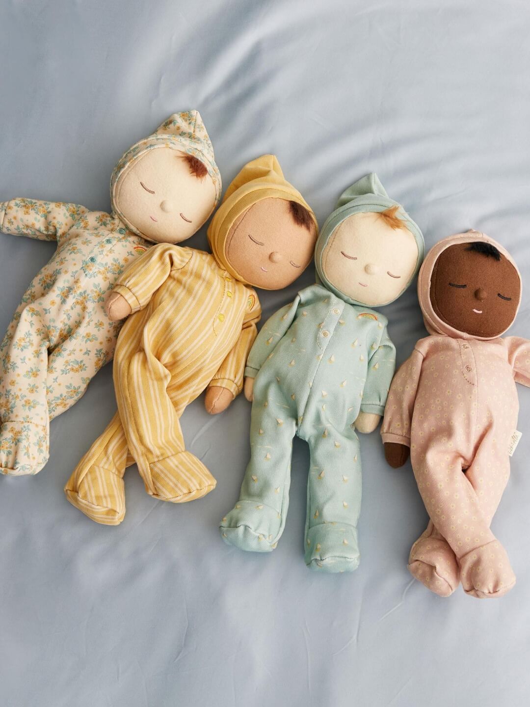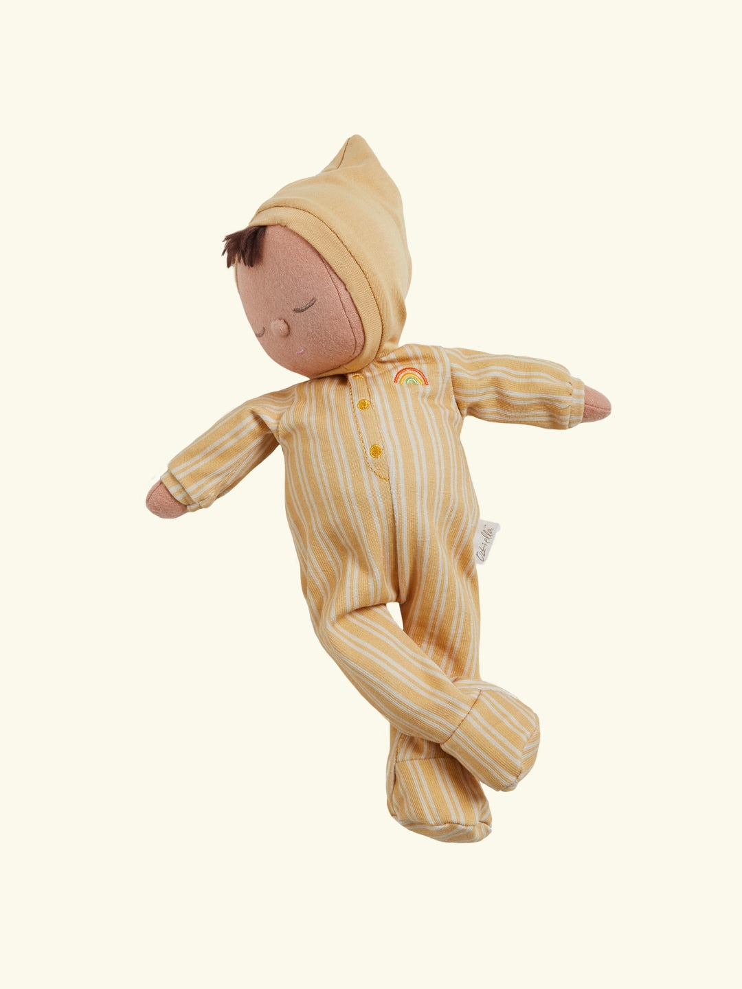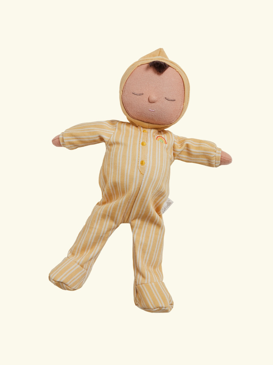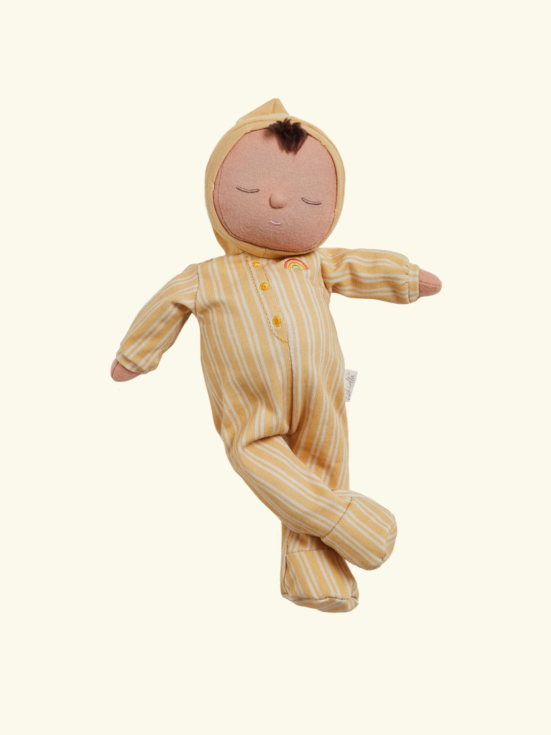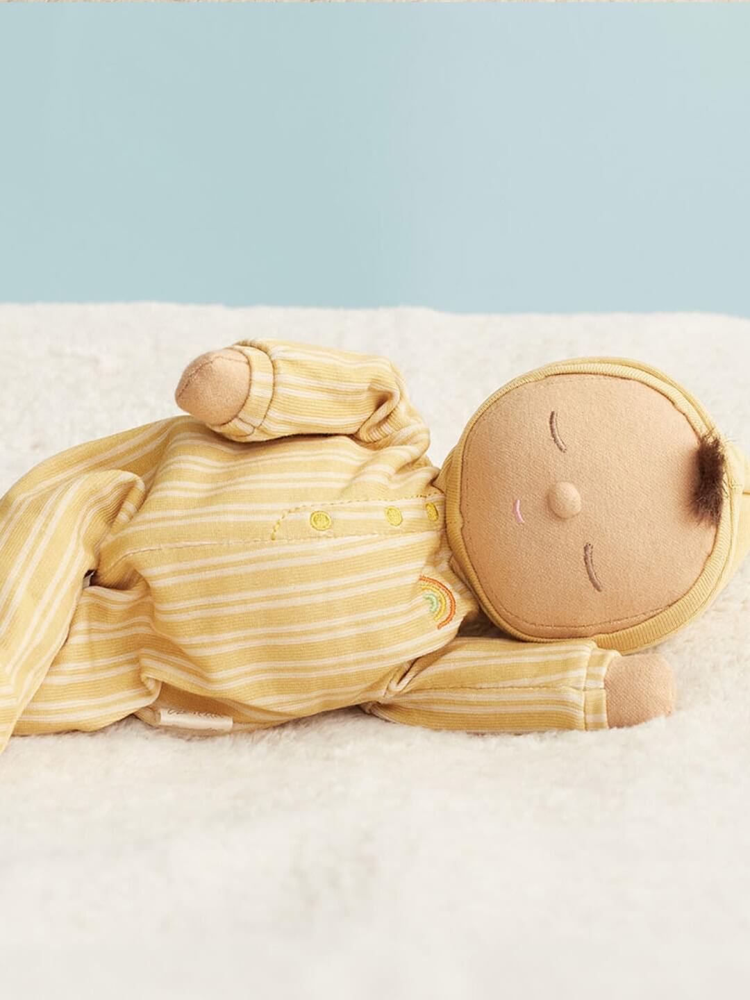 Pip Goldie is posable, made from super soft cotton and features the sweetest embroidered face with a little tuft of hair. Each Daydream Dozy Dinkum wears a non-removable suit complete with a rainbow right over their heart.